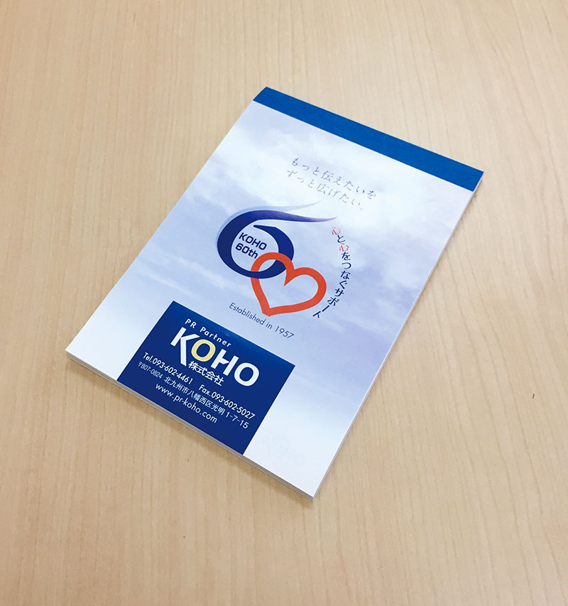 日頃のご愛顧に心から御礼申し上げます。今年弊社は旧社名時代を含め設立60周年を迎えます。7年前に商号をKOHO株式会社に変更し、新たなスタートをきりました。半世紀以上の60年を迎えられた事は、お客様のお引き立てがあってこそと社員一同感謝しております。このメモ帳はお客様が弊社を一番身近に感じていただき、小さなお役に立てる物として作成しました。あなたの良きコミュニケーション・ツールとしてお使いください。